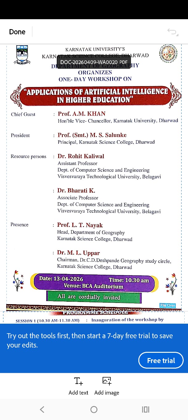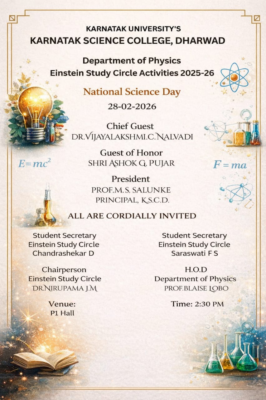 Karnatak Science College is a constituent college of the Karnatak University, Dharwad. The college is located in fifty five acres of hill with ever green natural vegetation and well balanced bio-diversity, beautiful and spacious class rooms, and well equipped laboratories. This college is popularly known as KCD (now KSCD), and has produced many eminent personalities, not only in the field of science and technology, but also in law, education and business. More than two thousand students from all walks of life and culture study in this college every year. The academic atmosphere on the campus makes our students sharp thinkers, critical writers, eminent speakers and excellent academic achievers. This is an institution which is known for liberal education in basic and applied sciences in North Karnataka. In the present world of competition, the faculty members and students of KSCD have learnt to continuously innovate and re-adopt themselves to the changing world. The college, under the guidance of dynamic management headed by The Honorable Vice-Chancellor Dr.A.M.Khan. of Karnatak University continues to encourage the improvement of infrastructural facilities and human resources in order to enhance academic excellence, spirituality, social relevance and the overall personality development of students belonging to all sections of society.
